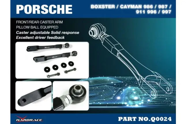 HARDRACE REGULEERITAV EESMINE JA TAGUMINE PÖÖRDUMISÕÕR PORSCHE 996/997/986/987 mudelitele. Valmistatud alumiiniumisulamist, varustatud kuulpadjaga puksidega, tagavad suurepärase stabiilsuse suurel kiirusel sõites või järskudel kurvides. Sepistatud alumiinium suurima vastupidavuse tagamiseks. Varustatud esmaklassiliste kuulpadjaga puksidega. Suurepärane tugevus ja vastupidavus. Otse originaalvaruosade asendus. Parandab märkimisväärselt juhitavust.