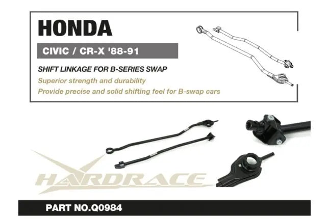 Käiguvahetushoovastiku komplekt on loodud sobima Civicu ja CR-X '87-91 mudelitele B-seeria mootorile üleminekul. Sellel on ülitugev terasest torukonstruktsioon otsesema käiguvahetuse tagamiseks, mis on teie B-seeria Civicu/Integra mootori jaoks hädavajalik.