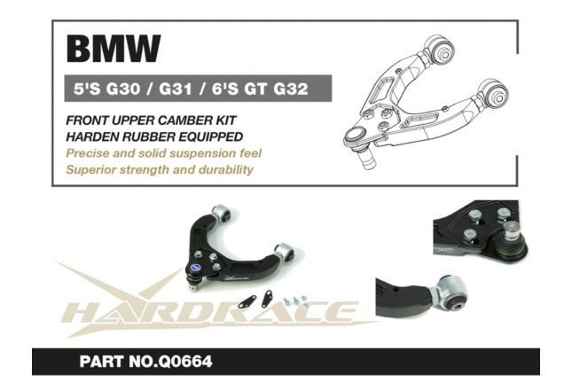 Esiosa ülemise kaldenurga komplekt võimaldab sõiduki esiotsa kaldenurka peenhäälestada. See aitab parandada haarduvust kurvides või taastada auto algse joonduse pärast madalamale tõstmist. Õõtsad on valmistatud ülitugevast CNC-alumiinium anodeeritud pinnaga, et pakkuda suurt vastupidavust, tugevust ja samas kerget kaalu. Kvaliteetsete karastatud kummist pukside ja kuulliigenditega pakuvad need ka paremat juhitavust võrreldes tehasekomponentidega.