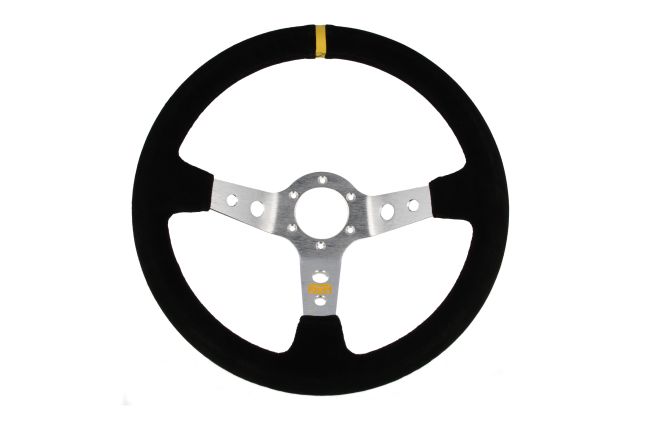 QSP Products'i seemisnahast sportrool. Selle sportrooli mudeli läbimõõt on 350 mm ja see on süvendatud 3 hõbedase anodeeritud alumiiniumist kodaraga. Rooli sügavus on 90 mm, mis tähendab, et rool on 90 mm võrra edasi võrreldes tavalise rooliga. Sportrool tarnitakse koos signaaliga ja roolirõngaga.