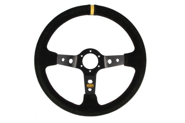 QSP Products'i seemisnahast sportrool. Selle sportrooli mudeli läbimõõt on 350 mm ja see on süvendatud 3 musta anodeeritud alumiiniumist kodaraga. Rooli sügavus on 90 mm, mis tähendab, et rool on 90 mm võrra edasi võrreldes tavalise rooliga. Sportrool tarnitakse koos signaaliga ja roolirõngaga.